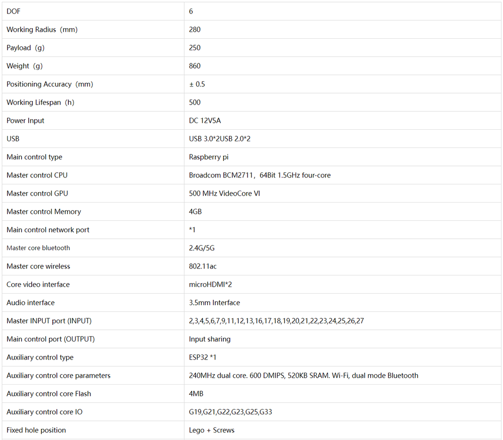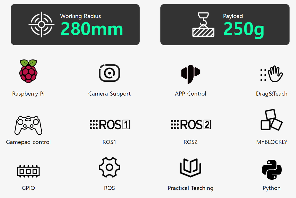 myCobot 280 시리즈는 교육 및 연구 개발용을 위해 개발한 6축 협업 로봇입니다. 전 세계 50개 이상의 국가 및 지역에 판매되었으며 수만 명의 사용자가 myCobot ARM 로봇을 배우고 적용하는 편리함과 효율성을 경험하고 있습니다.