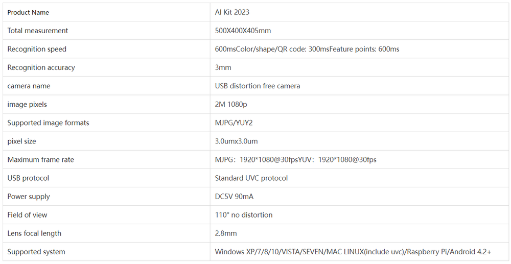 인공 지능 키트 총 5가지의 비전 인식 프로젝트와 7개의 하드웨어 부품으로 구성었습니다. 색상인식, 객체감지 및 인식, 물체이동 등 다양한 미션 수행을 통해 문제해결 능력 및 로봇의 메커니즘을 이해 할 수 있습니다.