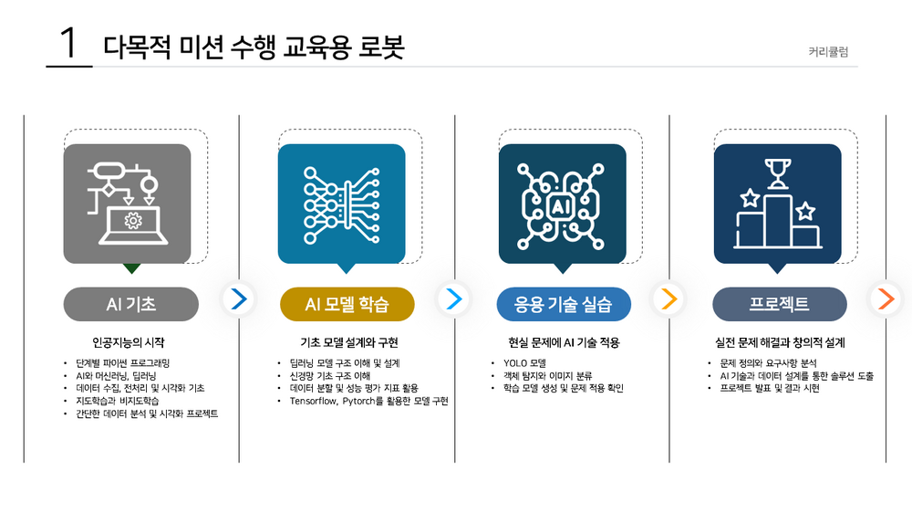 다목적 미션 수행 교육용 로봇은 다양한 환경에서 주어진 미션을 수행할 수 있도록 설계된 로봇으로, 프로그래밍 교육, 인공지능 연구, 로봇 공학 실습 등에 활용됩니다. 이 로봇은 자율주행, 장애물 회피, 물체 탐색, 원격 조종 등 다양한 기능을 지원
