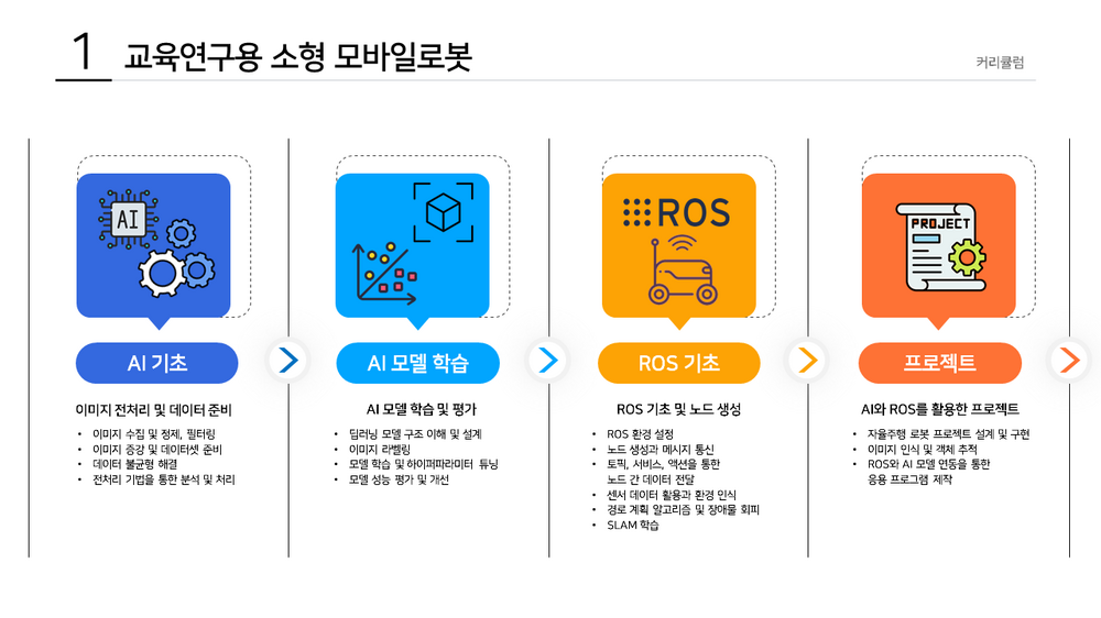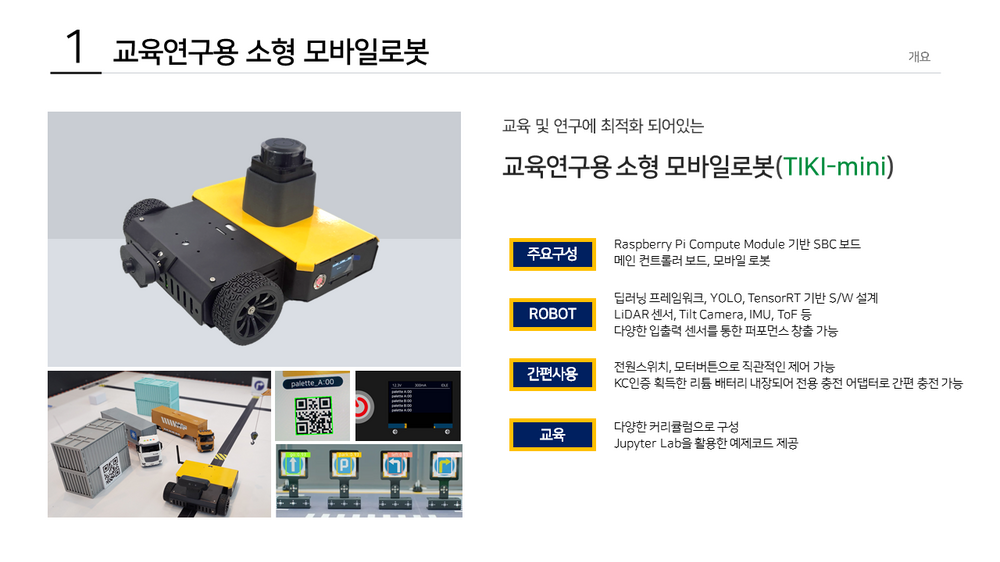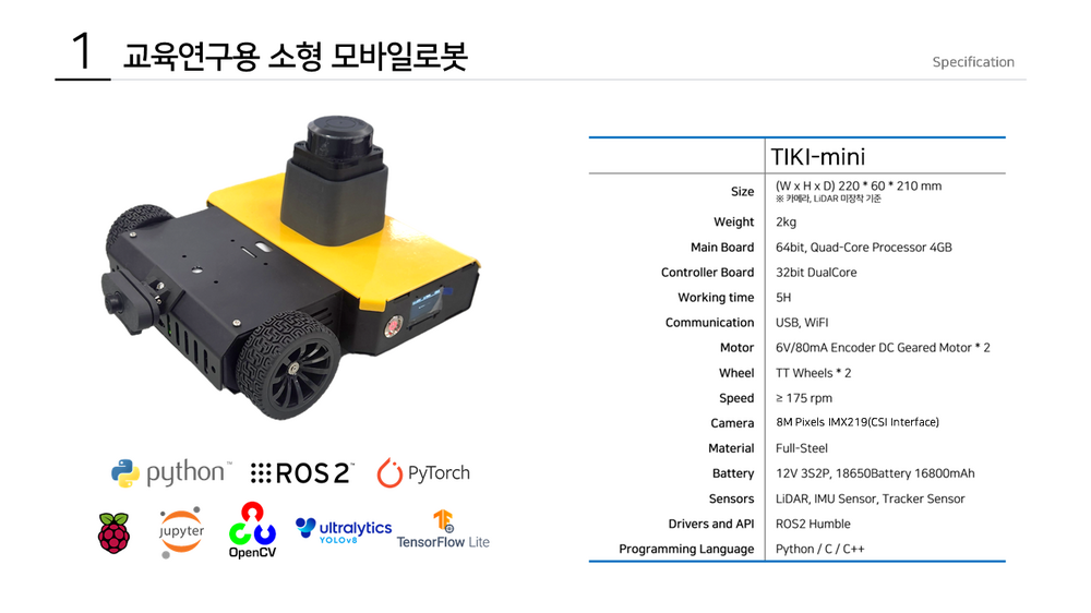 교육 연구용 소형 모바일 로봇은 프로그래밍, 인공지능(AI), 로봇 공학 등의 연구와 교육을 위해 설계된 로봇입니다. 주로 대학, 연구소, 코딩 교육 기관 등에서 활용되며, 다양한 센서와 모터를 탑재하여 주행, 장애물 회피, 라인트레이싱, SLAM(동시적 위치추정 및 지도작성) 등의 기능을 제공